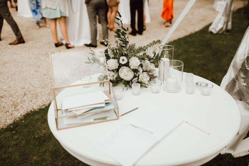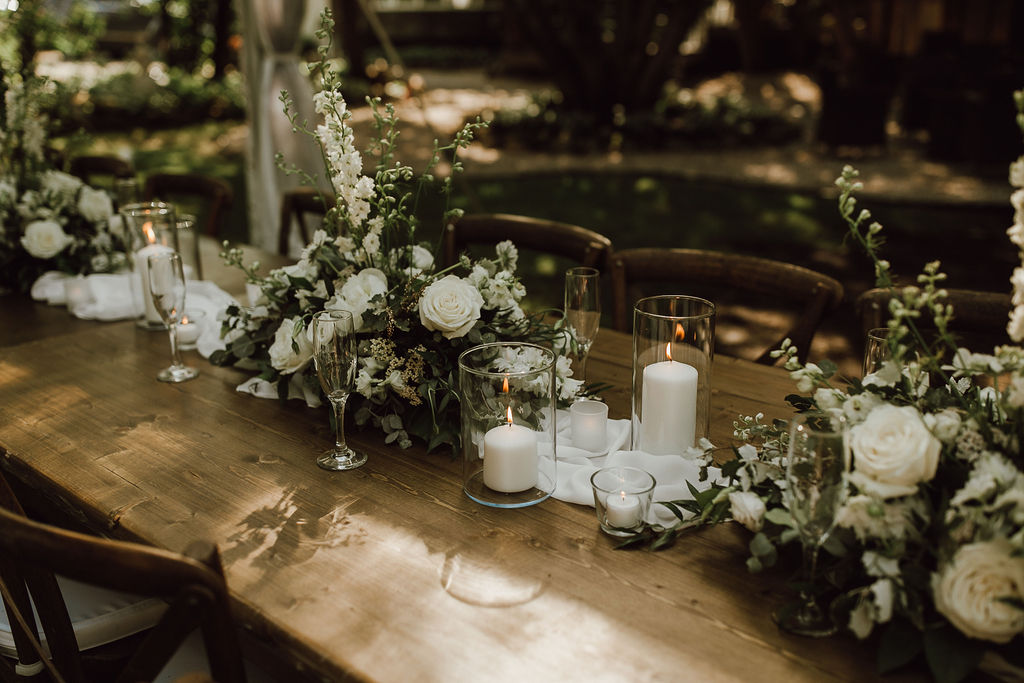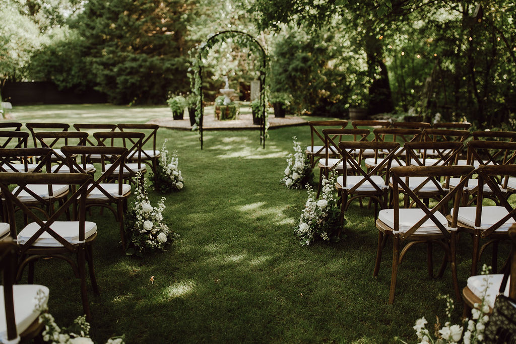 Upon arrival, guests were greeted by this little guy and a gorgeous sign to set the tone. Any wedding with a dog, is sure to be a good one. Everyone was able to catch a glimpse of the tent before heading over to the gorgeous greenery garden where the ceremony took place. We kept our design theme using strictly wood tones, white and greenery. Simple yet effective, this allowed the space and the couple to shine.