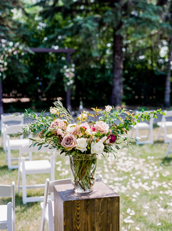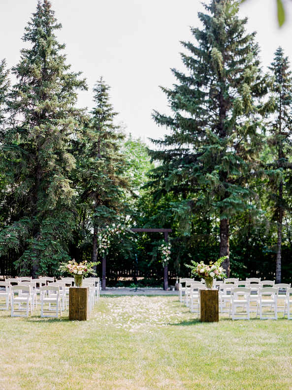 The ceremony at Ashgrove Acres is a large and greenery-filled space. The two pillars placed at the beginning of the aisle brought your attention to the beautiful floral arrangements both on the arch and placed on the pillars. The beauty of the trees and lush surroundings created a very magical space for Erika and Jace to tie the knot.