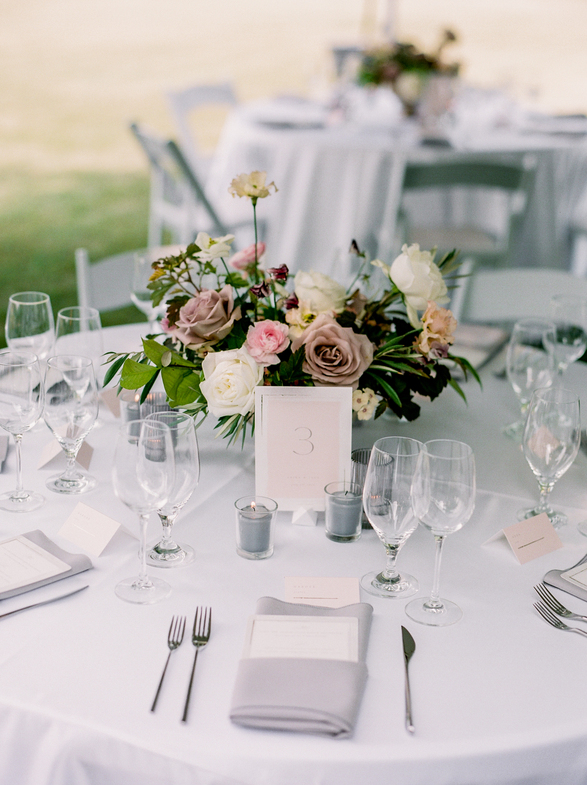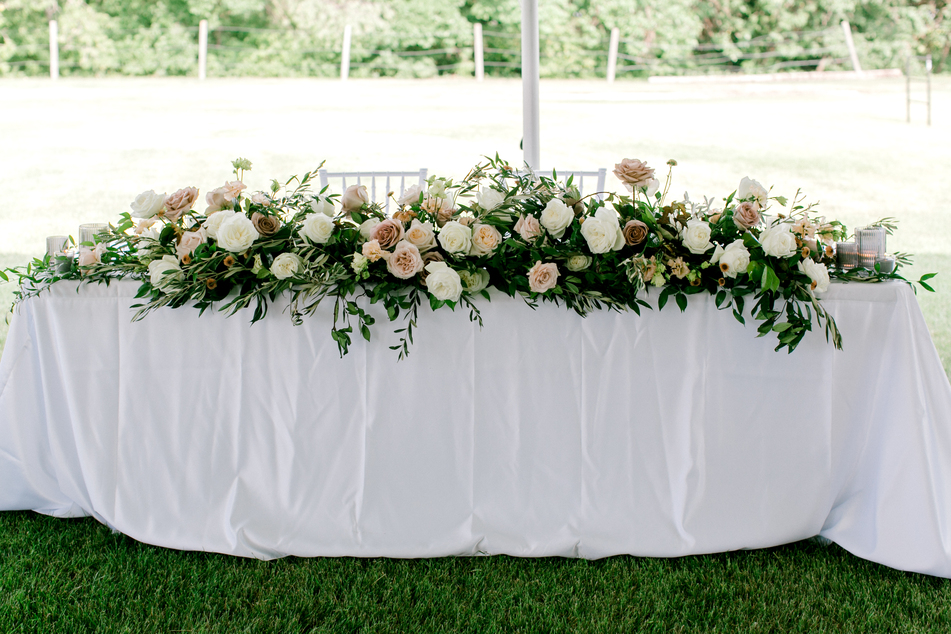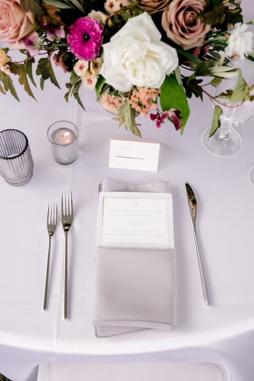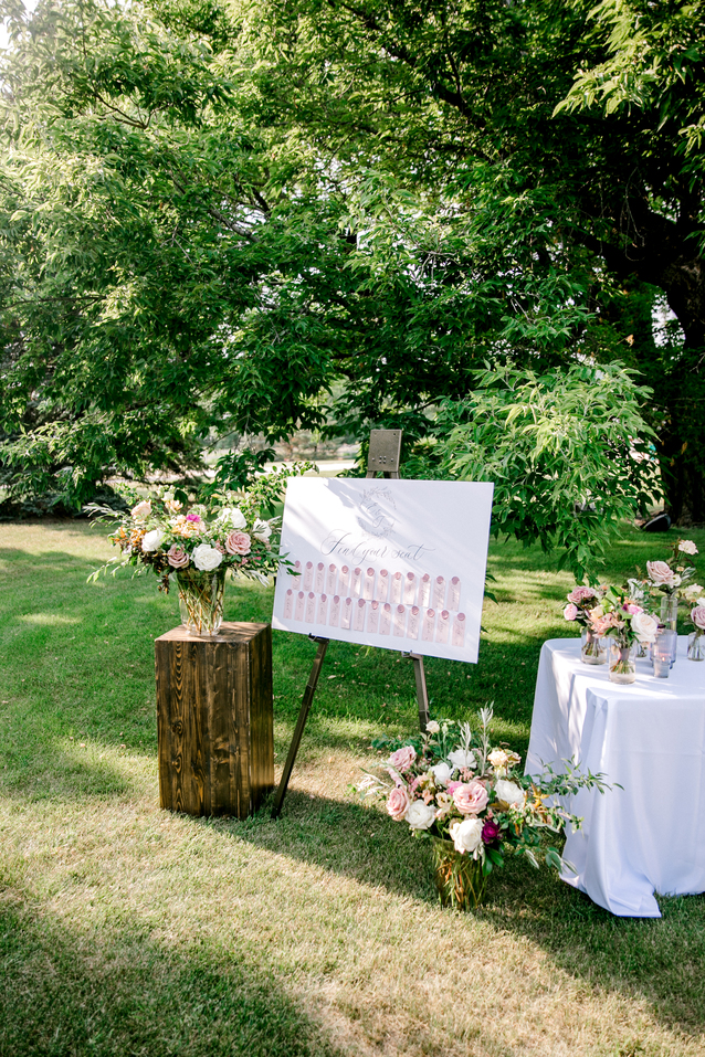 The original plan was for the couple to use the indoor reception space at Ashgrove Acres but we opted for an outdoor tent due to current restrictions. The tent was situated right beside a beautiful sprawling tree that allowed guests to find their seats on the seating chart and write in the guest book. From there, guests were able to grab a signature drink at the bar and play some outdoor lawn games while appetizers were served.