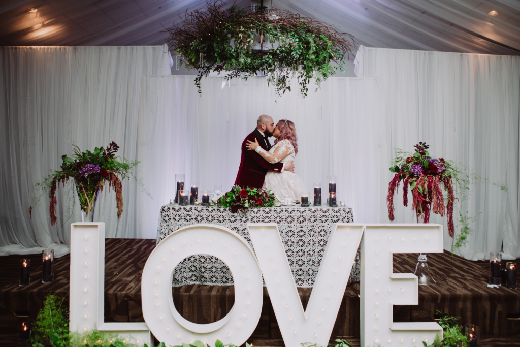 Once the ceremony ended, guests made their way to the The Gates for cocktails and reception. Guests we’re absolutely blown away when they entered the space! The lighting was dim and accented by candles and the perfect ambient uplighting and marquee LOVE sign drawing the eyes to the head table.