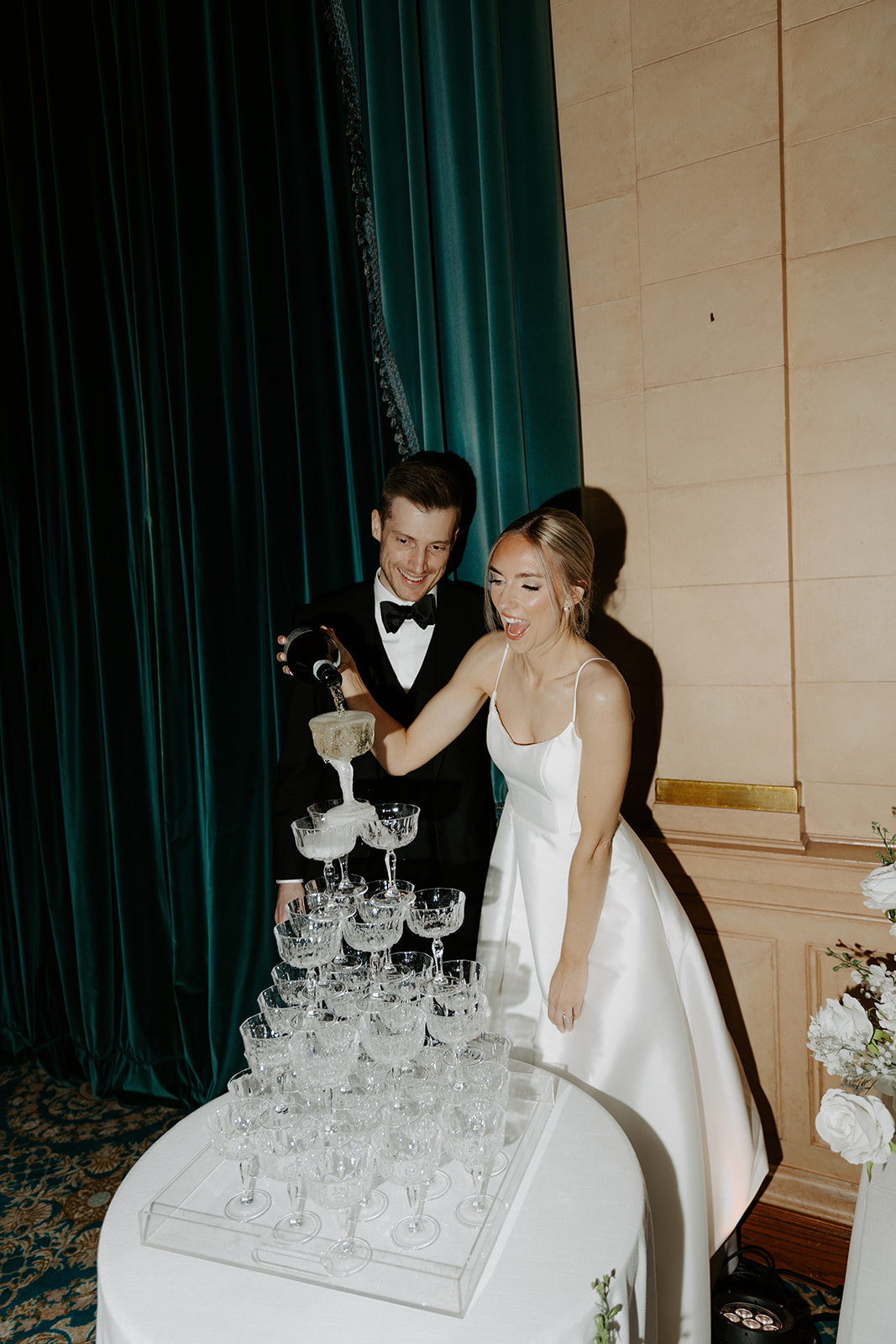 The floral arrangements were a work of art, featuring exquisite silk blooms that mimicked the beauty of fresh flowers while offering a lasting keepsake. They were modern-chic and oozed elegance; the perfect touch to the day. Adding to the vintage charm was a small, beautifully decorated heart-shaped cake. It was a sweet nod to classic wedding traditions. A show-stopping champagne tower added a luxurious celebratory flair that created a memorable moment for the couple and their guests.